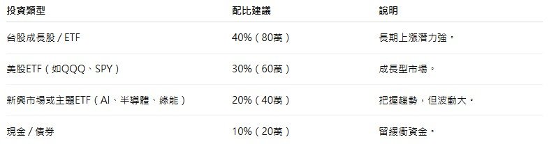 - 新興市場或主題ETF(AI、半導體、綠能) 20%(40萬) 把握趨勢,但波動大。