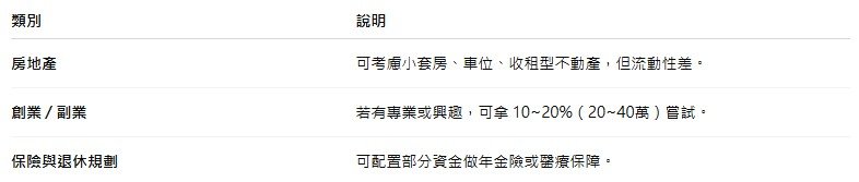 - 創業 / 副業 若有專業或興趣,可拿 10~20%(20~40萬)嘗試。
