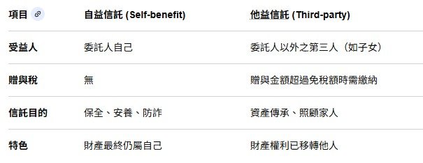 - 贈與稅: 自益信託因受益人為本人,不構成贈與行為,因此無贈與稅問題。