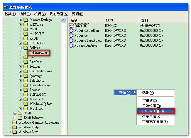• 點一下「Explorer」,在右邊視窗空白處,按滑鼠右鍵,新增「DWORD值」。