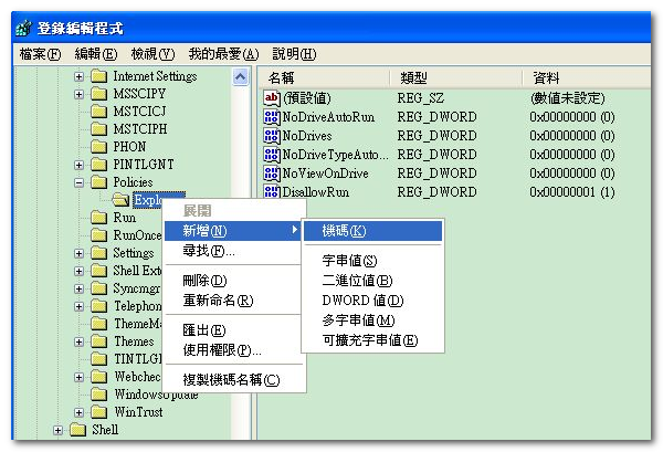 • 以滑鼠右鍵再點一下「Explorer」,新增「機碼」。