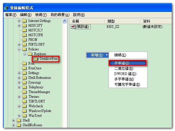 • 最後,在「DisallowRun」右邊視窗空白處,按滑鼠右鍵,新增「字串值」。