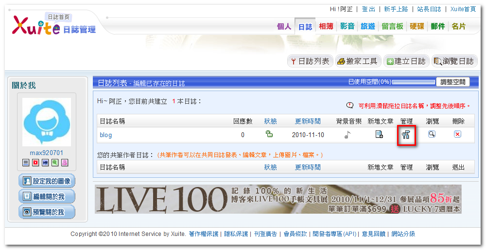 - 預設下,每位會員都有 1 本日誌-「blog」,點選其「管理」圖示。