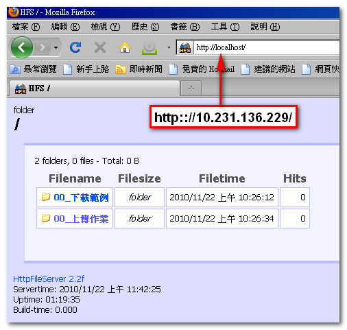 - 同學們只要在其瀏覽器網址列輸入「http://10.231.136.229/」,即可連上您的 HFS,進而下載範例或上傳作業。