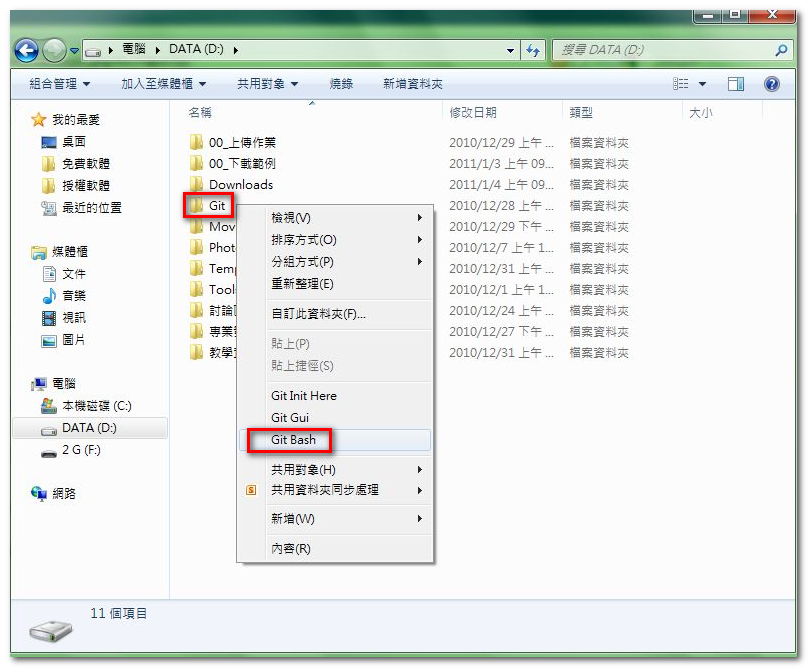 以滑鼠右鍵點選 D 磁碟區 /Git/ 資料夾,再點選「Git Bash」。