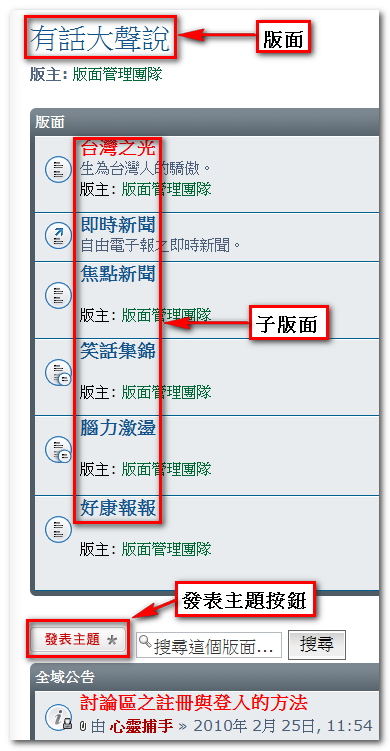 選擇適當的版面(子版面),點選「發表主題」圖示按鈕即可。