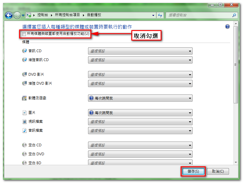 • 這個設定會停用其他類型磁碟機上的自動播放功能。如果磁碟機上的自動播放功能預設是停用的,您就無法使用這個設定來啟用該功能。